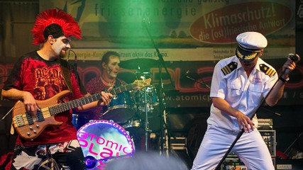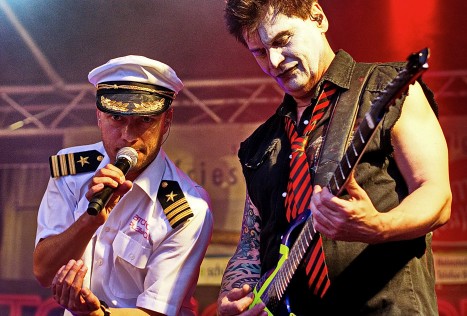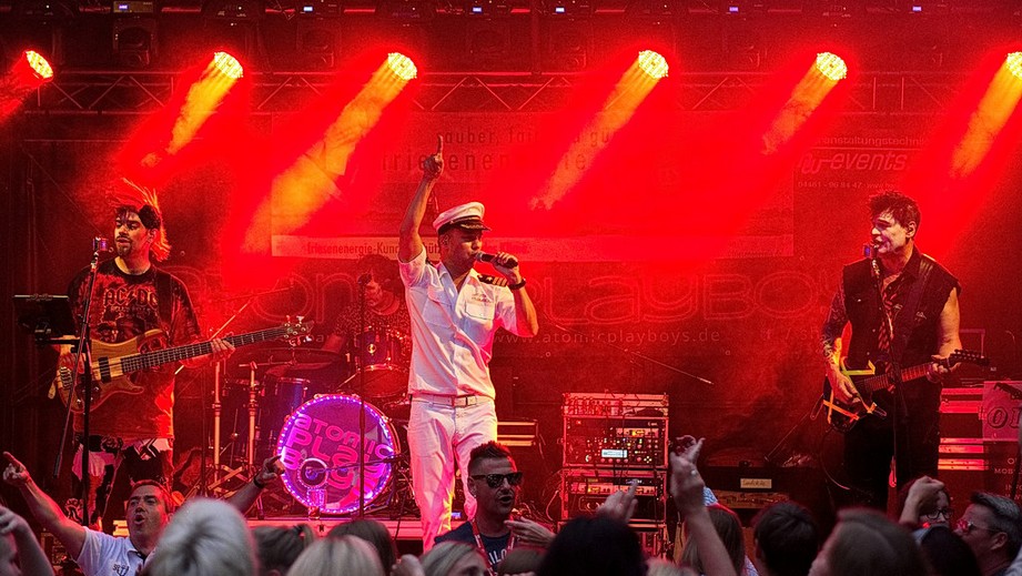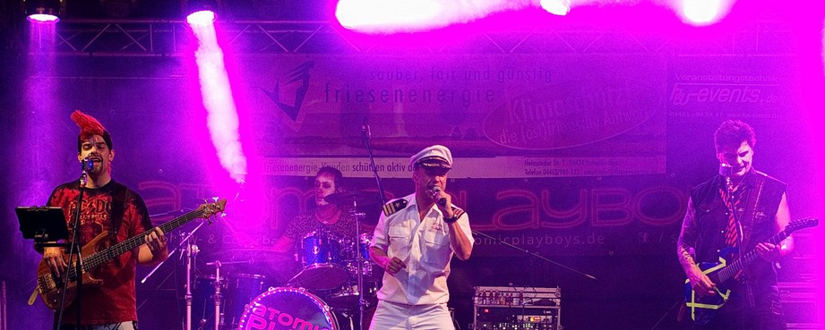 Auf den alljährlich in Hooksiel zu Pfingsten veranstalteten „Heringstagen“ spielte 2017 u. a. die Band Atomic Playboys, die sich selbst als eine Show- und Coverband aus Hamburg bezeichnet. Mitreißend und souverän spielten sie ihr mehrstündiges Programm mit Musik von den Siebzigern bis heute: Überwiegend gute, durchaus auch härtere Rockmusik. AC/DC und Kiss klangen dank Frontmann Saschas gesanglicher Qualitäten fast wie die Originale. Auch interessante „Interpretationen“ deutscher Schlager wurden geliefert; solcherart dargeboten, gefiel mir ausnahmsweise sogar ein (für mich ansonsten übler) Helene-Fischer-Titel. |