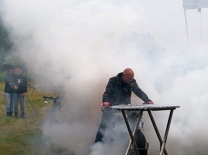 Die Stimmung war trotz des Regens gut; auch für kleine Biker-Spielchen fanden sich Raum und Zeit: Hier hieß es Gas geben, bis der Reifen platzt:-)